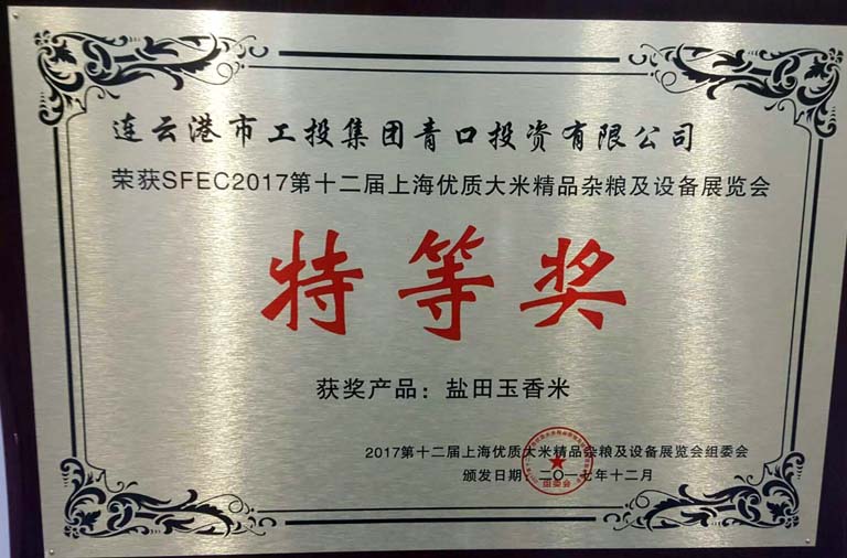 日前,青口投資公司“鹽田玉”大米在2017第十二屆上海優(yōu)質(zhì)大米及精品雜糧展覽會(huì)上榮獲特等獎(jiǎng),這是繼“江蘇好大米”稱號(hào)之后的又一重大殊榮。