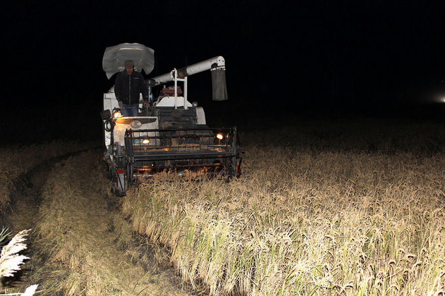 119夜七時(shí)許,青口投資公司大新農(nóng)場(chǎng),工會(huì)副主席王士超作為巡查組成員,正在組織二分場(chǎng)趙華勇條田水稻種植戶在搶收水稻。
