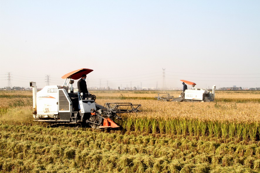 青口萬畝連片水稻開鐮收割