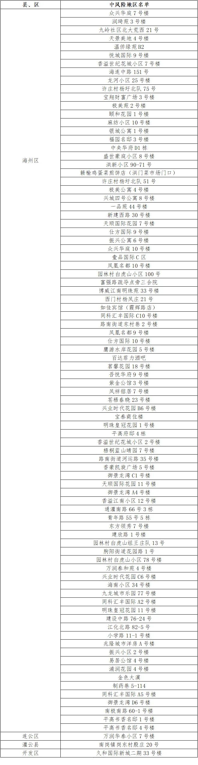 根據(jù)國務(wù)院聯(lián)防聯(lián)控機(jī)制有關(guān)規(guī)定,經(jīng)綜合評估研判,市指揮部決定,自發(fā)布之日起,將海州區(qū)浦潤花園4號樓、金色大漠、制藥巷5-114、同科匯豐國際A5號樓、御景龍灣D6號樓、南極南路60-1號樓、平高書香名邸1號樓、平高書香名邸4號樓調(diào)整為中風(fēng)險(xiǎn)地區(qū)。