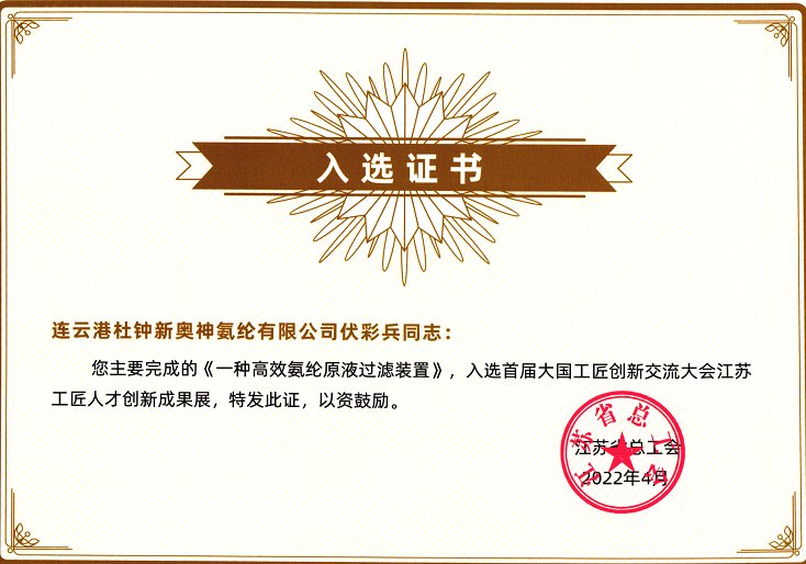 近日,全國總工會主辦首屆大國工匠創(chuàng)新交流大會,氨綸公司伏彩兵完成的《一種高效氨綸原液過濾裝置》創(chuàng)新成果入選大國工匠展伏彩兵入選首屆大國工匠創(chuàng)新交流大會江蘇展區(qū)重點展示科創(chuàng)推薦通道。本次大會以技能強國,創(chuàng)新有我”為主題,通過線上線下形式展示以大國工匠為代表的廣大職工的精湛技能和創(chuàng)新成果,為廣大高技能人才搭建交流平臺。