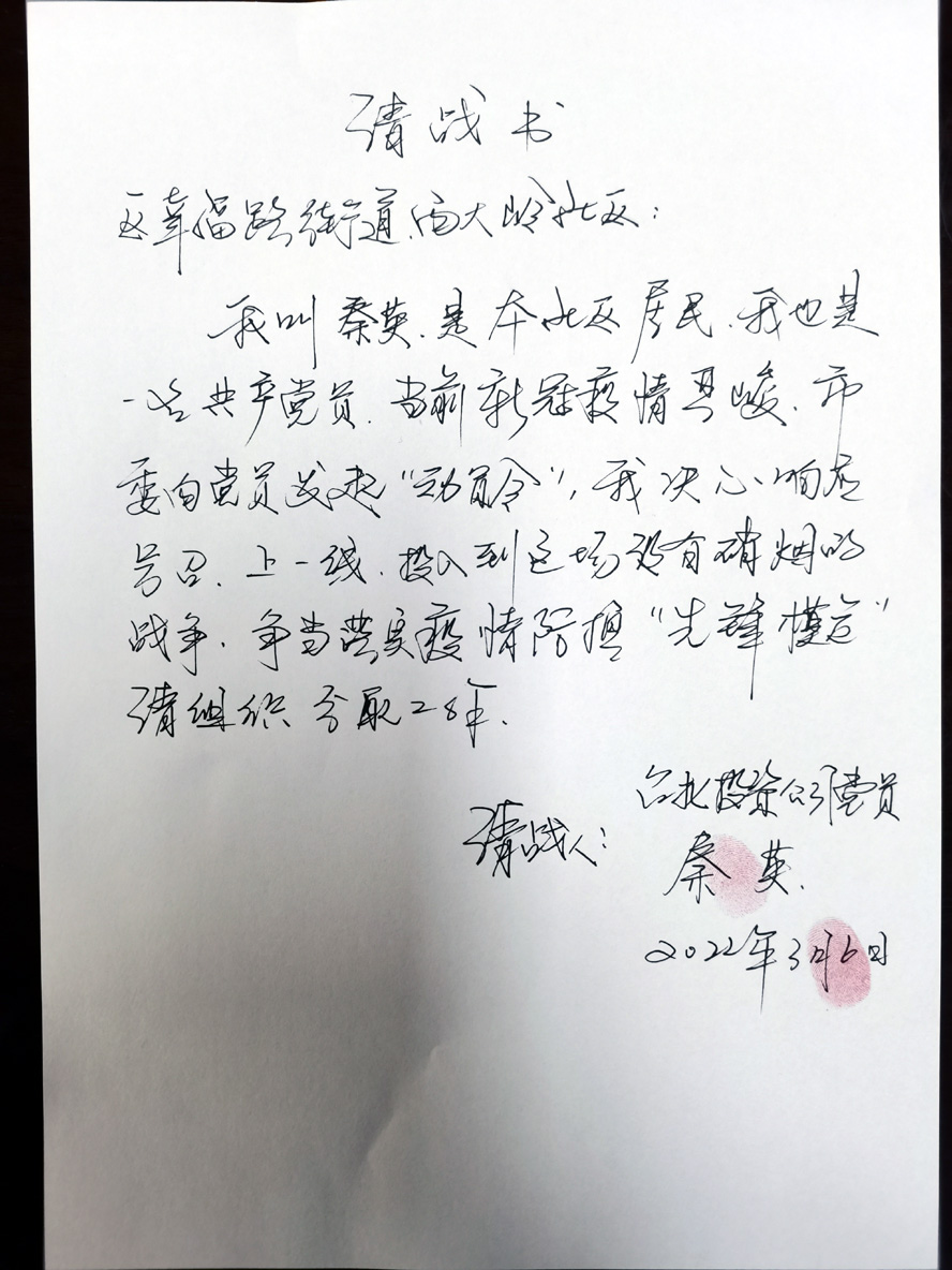 “我做的這一切都不算什么,你們看看那些醫(yī)護人員,他們才是真正的英雄,他們坐到那張桌子上,一般來講都會超過12個小時,為了不上廁所,人家連水都不喝一口,他們才是真的英雄。”面對筆者的采訪秦英一個勁的推辭:“我們之所以能戰(zhàn)勝疫情就是因為我們有偉大的黨,因為有全心全意為人民服務(wù)的共產(chǎn)黨員。我是共產(chǎn)黨員,這都是我應(yīng)該做的。”秦英樸質(zhì)又?jǐn)S地有聲的話語,體現(xiàn)了一名老黨員抗責(zé)在肩、以身作則、勇挑重?fù)?dān)的崇高情懷,代表了一大批退休老黨員以百姓之心為心的高尚品德,彰顯了共產(chǎn)黨人為人民謀幸福的初心。