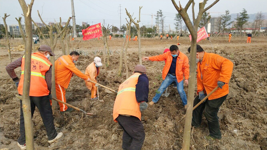 為保證植樹質(zhì)量,該公司配備多名專業(yè)技術(shù)人員進(jìn)行全程技術(shù)指導(dǎo)。上午8時(shí)許,在移苗現(xiàn)場,一臺(tái)挖掘機(jī)轟隆隆地作業(yè)著,小心翼翼的將一棵棵大樹苗連根拔起,在保證不擠壓的情況下,輕抬輕放,裝苗運(yùn)輸。在栽苗活動(dòng)現(xiàn)場,全體工作人員戴好頭罩、手套等防護(hù)用具,在統(tǒng)一指揮下,彼此間隔1米左右,擼起袖子、揮著鐵鍬、扛著鋤頭飛快地投入到栽苗植樹作業(yè)中。大家分工協(xié)作,有的開槽挖坑;有的栽植樹苗;有的抬木扶苗;有的回填新土;有的纏繩護(hù)樹;有的澆水保濕……到處都是忙碌的身影,整個(gè)植樹活動(dòng)現(xiàn)場一片熱火朝天的繁忙景象。放眼望去,在明媚的春光中,一排排新栽下的樹苗迎風(fēng)挺立,生機(jī)勃勃,組成了一道道靚麗的風(fēng)景線。