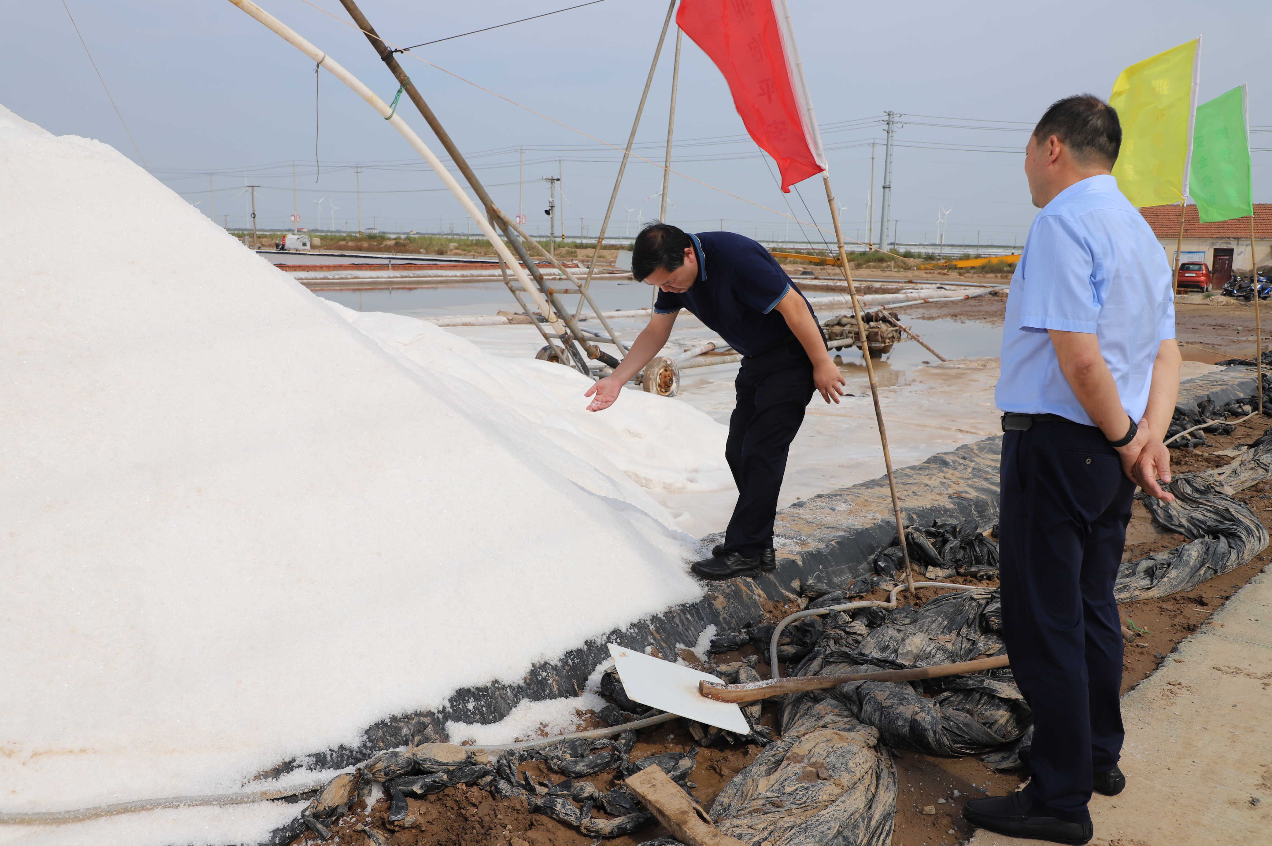 調(diào)研組一行先到新河十三班參觀現(xiàn)場(chǎng)扒鹽,李國(guó)文董事長(zhǎng)向調(diào)研組一行介紹了目前日曬制鹽公司采用的帶鹵扒鹽技術(shù),并就目前鹽業(yè)生產(chǎn)、運(yùn)輸、銷售等情況進(jìn)行了簡(jiǎn)單的介紹。
