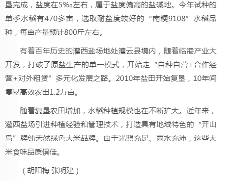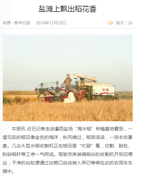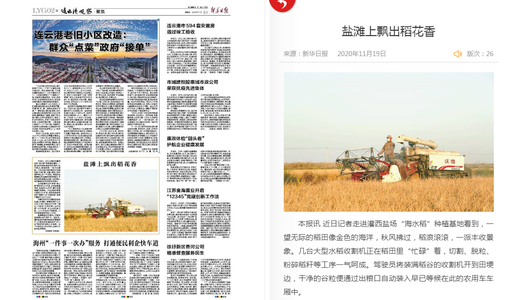 11月19日新華日報報道灌西“海水稻”豐收盛況:《鹽灘上飄出稻花香》