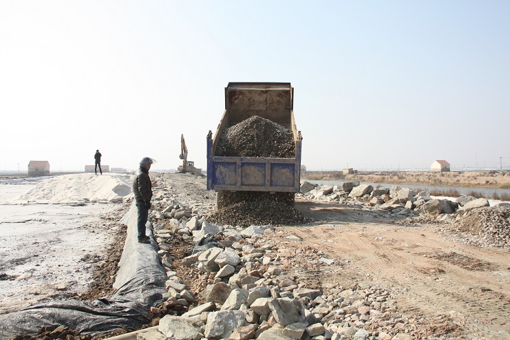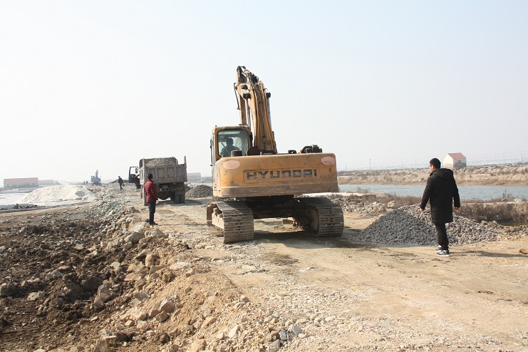 2月15日,在新河制鹽公司七至十班運(yùn)鹽路施工現(xiàn)場,我們看到南翼公司項(xiàng)目工程分公司的員工正在指揮兩臺小型工程車將石子傾倒在路基上,兩臺挖掘機(jī)正忙于將運(yùn)送來的石子整平。運(yùn)鹽河對面,三輛滿載土夾石的大型工程車一字排開,正等待卸載。據(jù)了解,目前正在施工的是新河制鹽分公司二期運(yùn)鹽路維修改造工程,該工程改造路段全長3300米,計(jì)劃總投資193萬元,其中路基鋪設(shè)部分由日曬制鹽公司出資45萬元,路面部分則由縣交通局承擔(dān),預(yù)計(jì)需要投入148萬元。該工程于去年底開始施工,預(yù)計(jì)三月中下旬全部鋪設(shè)完成。另外新河制鹽分公司一期一至十二班3300米運(yùn)鹽路改造工程計(jì)劃將于今年下半年實(shí)施。