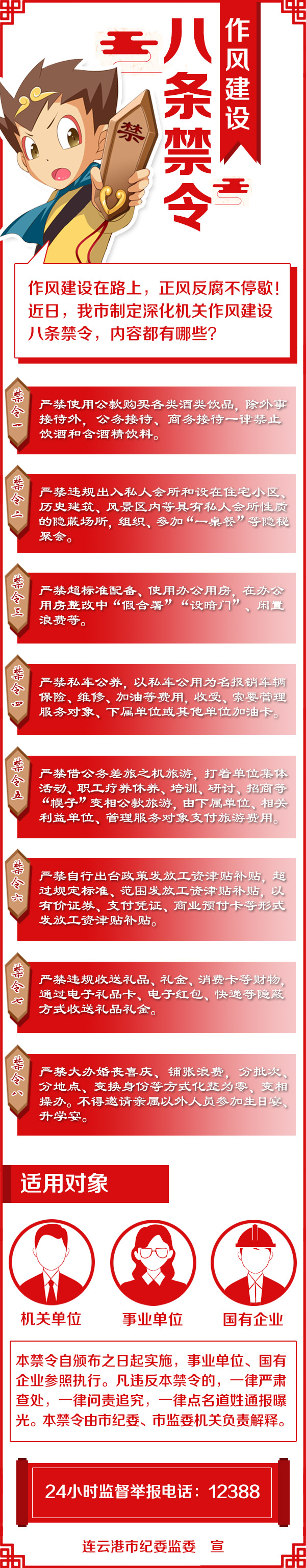 本禁令自頒布之日起實(shí)施,事業(yè)單位、國有企業(yè)參照執(zhí)行。凡違反本禁令的,一律嚴(yán)肅查處,一律問責(zé)追究,一律點(diǎn)名道姓通報(bào)曝光。本禁令由市紀(jì)委、市監(jiān)委機(jī)關(guān)負(fù)責(zé)解釋。24小時(shí)監(jiān)督舉報(bào)電話:12388。