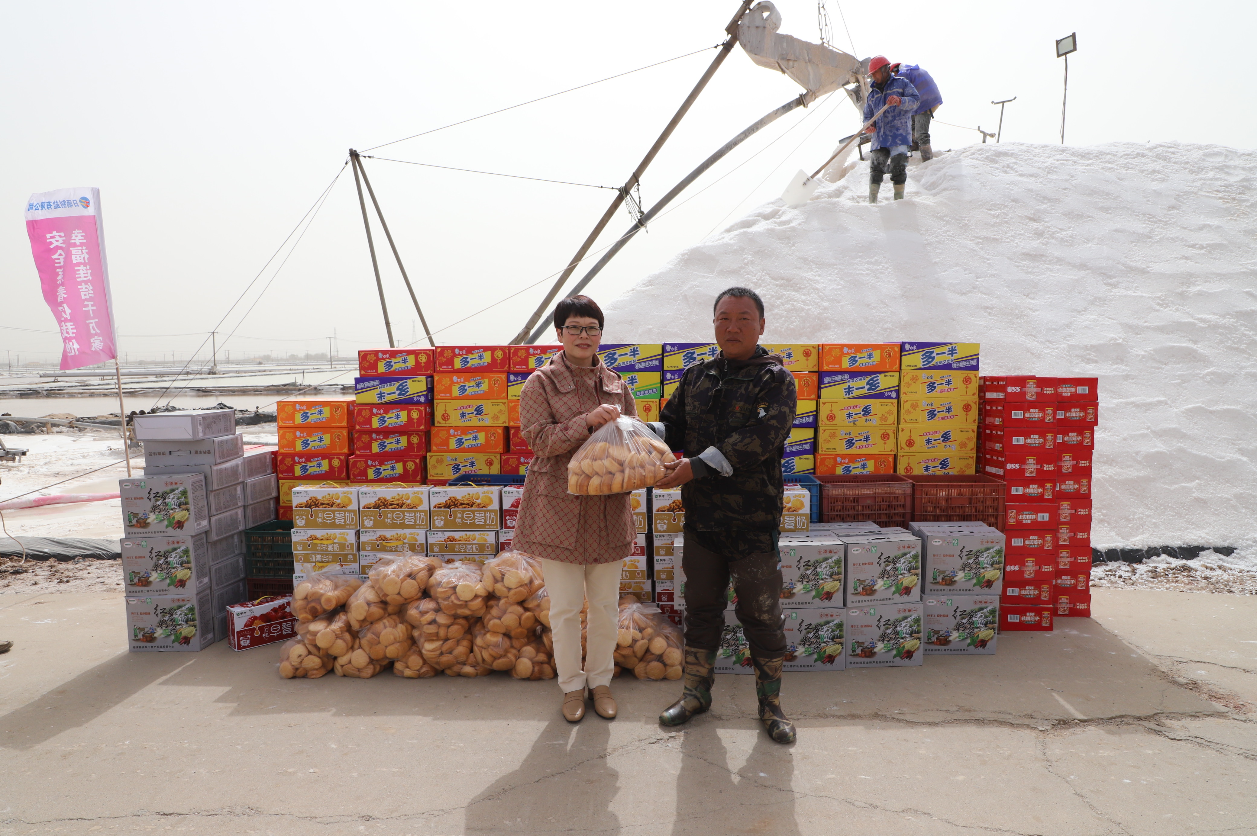 “你們辛苦了,我代表公司來看望大家。”在新河九班與埒南九班,王宏與扒鹽現(xiàn)場職工握手問好,感謝他們在過去的一年為日曬制鹽公司的原鹽生產(chǎn)所付出的辛勤努力,叮囑他們一定要落實(shí)落細(xì)扒鹽生產(chǎn)措施,增強(qiáng)責(zé)任感和警覺性,嚴(yán)格執(zhí)行各項(xiàng)規(guī)章制度,切實(shí)保障扒鹽期間的安全生產(chǎn),并送上雞蛋、八寶粥、方便面、牛奶等物品。