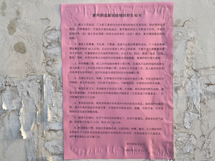 春節(jié)臨近,人員流動(dòng)增加,根據(jù)灌西投資公司疫情防控工作的需要,結(jié)合冬春季疫情形勢(shì),為切實(shí)加強(qiáng)生產(chǎn)一線(xiàn)疫情防控工作 ,進(jìn)一步防范疫情輸入,提高職工自我防護(hù)意識(shí),新河制鹽分公司1月12日在公司醒目位置張貼《疫情防控告知書(shū)》,并對(duì)各個(gè)班組發(fā)放《疫情防控告知書(shū)》,每位員工簽字并存檔。