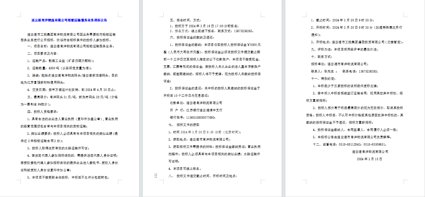 連云港宵洋物流有限公司船舶運(yùn)輸服務(wù)業(yè)務(wù)招標(biāo)公告