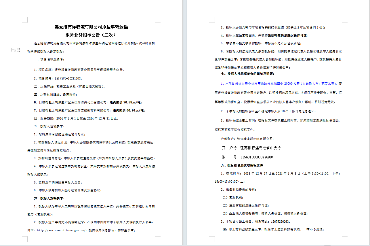 連云港宵洋物流有限公司原鹽車(chē)輛運(yùn)輸服務(wù)業(yè)務(wù)招標(biāo)公告(二次)