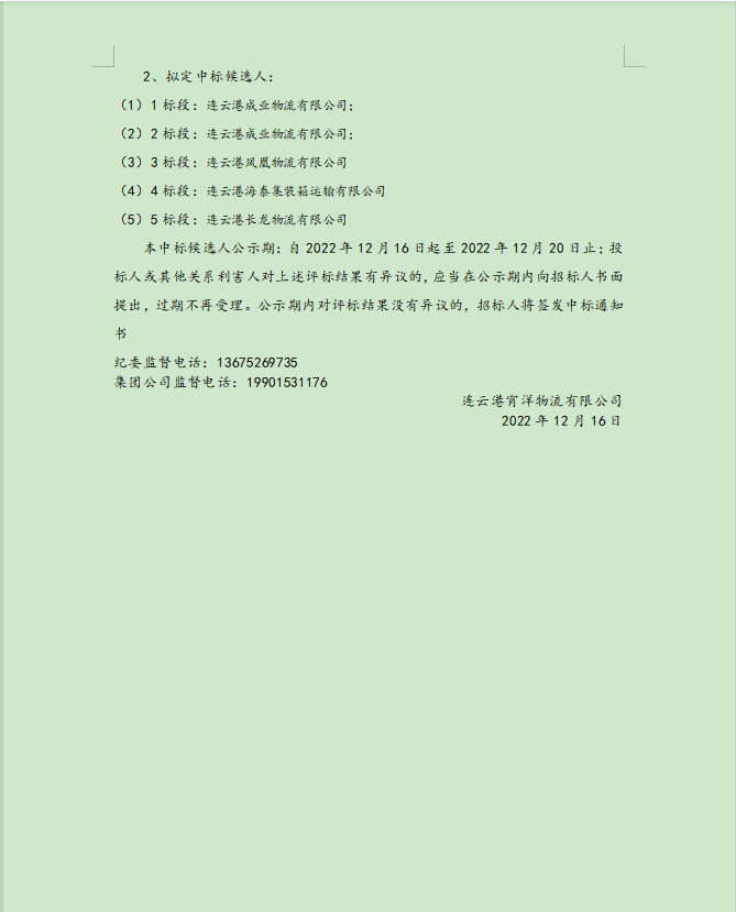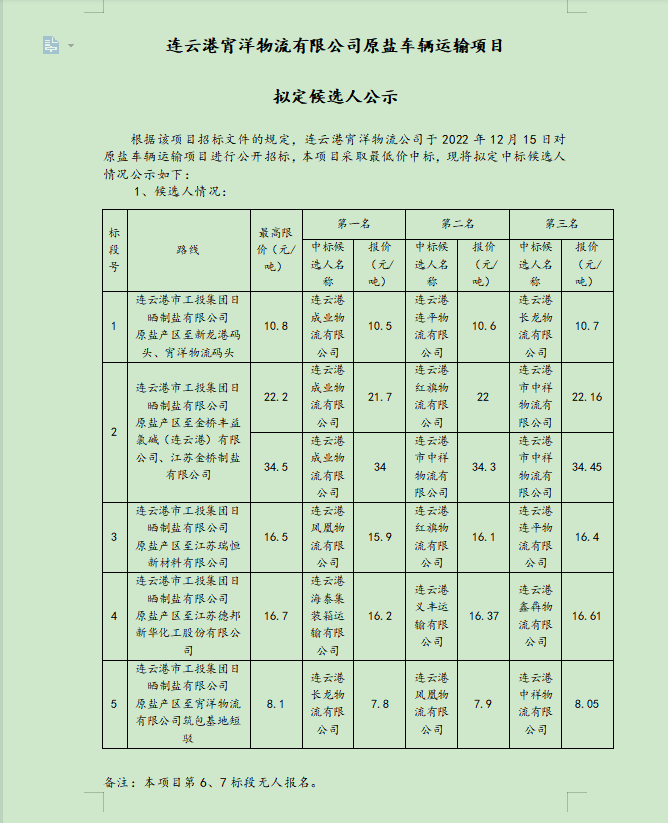 連云港宵洋物流有限公司原鹽車輛運(yùn)輸項(xiàng)目擬定候選人公示