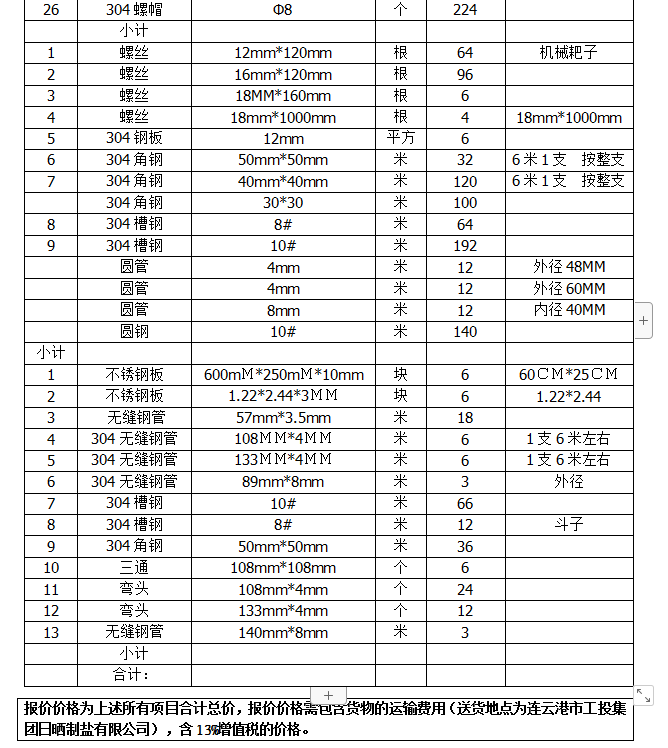 單價(jià)(含13%稅、運(yùn)輸費(fèi)用)。合同期間304不銹鋼單價(jià)不以304不銹鋼市場(chǎng)單價(jià)的變動(dòng)而作任何調(diào)整。