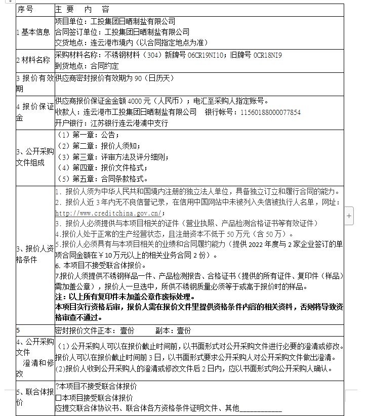 連云港市工投集團(tuán)日曬制鹽有限公司不銹鋼(304)采購(gòu)項(xiàng)目