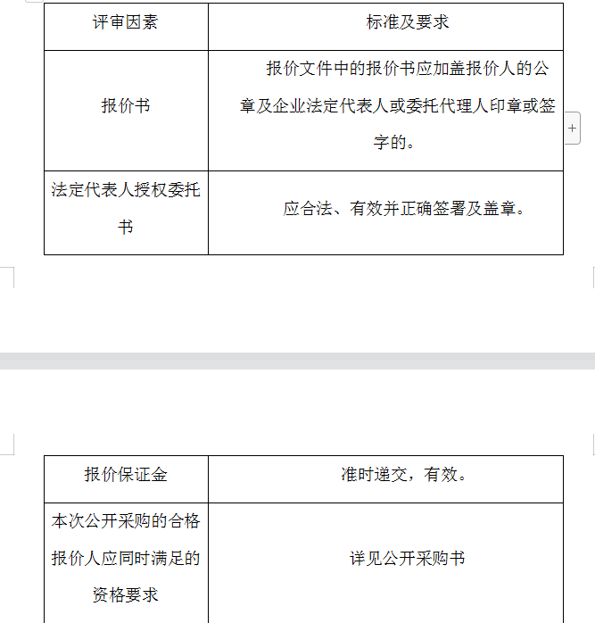 2、評(píng)審委員會(huì)將根據(jù)以下標(biāo)準(zhǔn)對(duì)各報(bào)價(jià)人進(jìn)行初步評(píng)審,有一項(xiàng)不符合要求的,作否決報(bào)價(jià)處理,不進(jìn)入詳細(xì)評(píng)審。