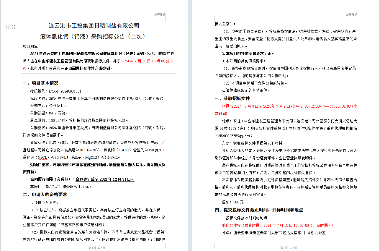 連云港市工投集團日曬制鹽有限公司液體氯化鈣(鈣液)采購招標公告(二次)
