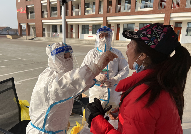圖為黨員霍晶協(xié)助醫(yī)務人員對居民進行核酸采樣