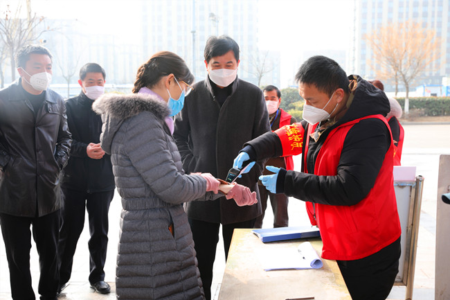 汪書記一行在公司疫情防控檢查站前,詳細(xì)了解了公司疫情防控情況,青農(nóng)一路作為主要的進(jìn)場(chǎng)通道,四個(gè)單位的黨員干部輪流值班,并設(shè)置臨時(shí)看護(hù)房,保證二十四小時(shí)值班。在鹽場(chǎng)家園小區(qū)僅保留一個(gè)出口,外來(lái)家用轎車一律禁止入內(nèi),每戶發(fā)一張通行證,嚴(yán)格管控人員流動(dòng)。汪書記得知物業(yè)公司還沒有完成,鼓勵(lì)大家非常時(shí)期用非常辦法,將工作做細(xì)做實(shí),想居民所想,嚴(yán)格做好防控工作。進(jìn)入小區(qū)前,汪書記也與居民一樣配合登記和測(cè)量體溫,當(dāng)看物業(yè)為了保證每天定時(shí)對(duì)單元和電梯間等重要場(chǎng)所的消毒存有大量消毒液,強(qiáng)調(diào)物業(yè)公司要增強(qiáng)消毒物品存放安全意識(shí),合理使用,盡最大努力保一方平安。