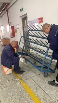 維修臺(tái)車時(shí),我當(dāng)起了孫師傅的下手,一邊將臺(tái)車穩(wěn)住不能傾倒,一邊看著孫師傅卸下每個(gè)車輪子并進(jìn)行仔細(xì)清理,不怕臟、不怕累,毫無(wú)怨言,一絲不茍,動(dòng)作利落,手法嫻熟,親身直面他的高效率和專業(yè)水平。他還對(duì)我詳細(xì)解說(shuō),讓我理解每個(gè)步驟的重要性和關(guān)鍵點(diǎn)。我們蔣姐也過(guò)來(lái)幫忙,不停的清掃臺(tái)車上清理出來(lái)的垃圾……