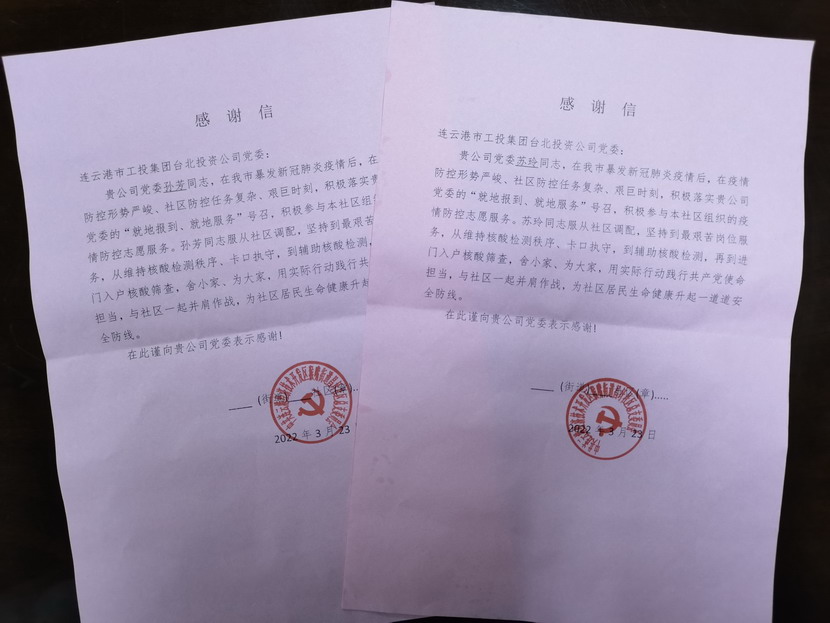 “臺(tái)北投資公司的黨員同志們視疫情防控為己任,服從調(diào)度安排,站好每一班崗,不僅認(rèn)真履行防控職責(zé),又創(chuàng)新開展疫情防控教育宣傳、便民服務(wù)等多項(xiàng)活動(dòng),成為我們社區(qū)防疫攻堅(jiān)的主力軍。”325日,收到開發(fā)區(qū)猴嘴街道昌圩社區(qū)送來的一份特殊的“禮物”— 一封疫情防控感謝信,感謝臺(tái)北投資公司黨員蘇玲、孫芳等同志在新冠肺炎疫情防控的關(guān)鍵階段挺身而出、伸出援手,參與協(xié)助社區(qū)的疫情防控工作。