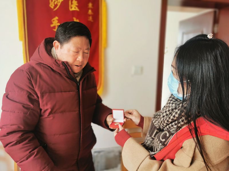 為老黨員送上學雷鋒紀念章