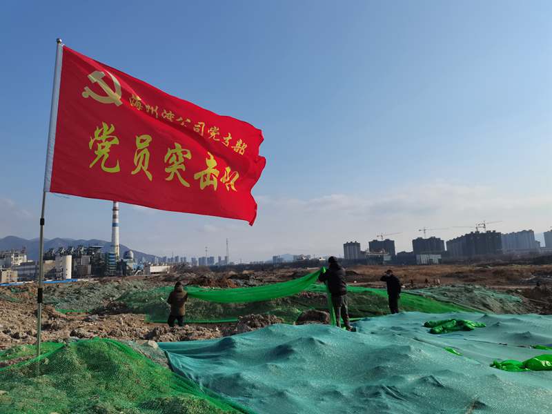 1月20日,在臨達公司330畝貨場的一處“山丘”上,一面鮮紅的海州灣黨支部“黨員突擊隊”旗格外引人注目。當(dāng)天中午12時,聽聞兄弟單位臨達公司急需人手苫蓋防塵網(wǎng),支部書記劉天義一聲令下,海州灣“黨員突擊隊”立即集結(jié),穿戴好勞動裝備,奔赴環(huán)境整治“主戰(zhàn)場”。