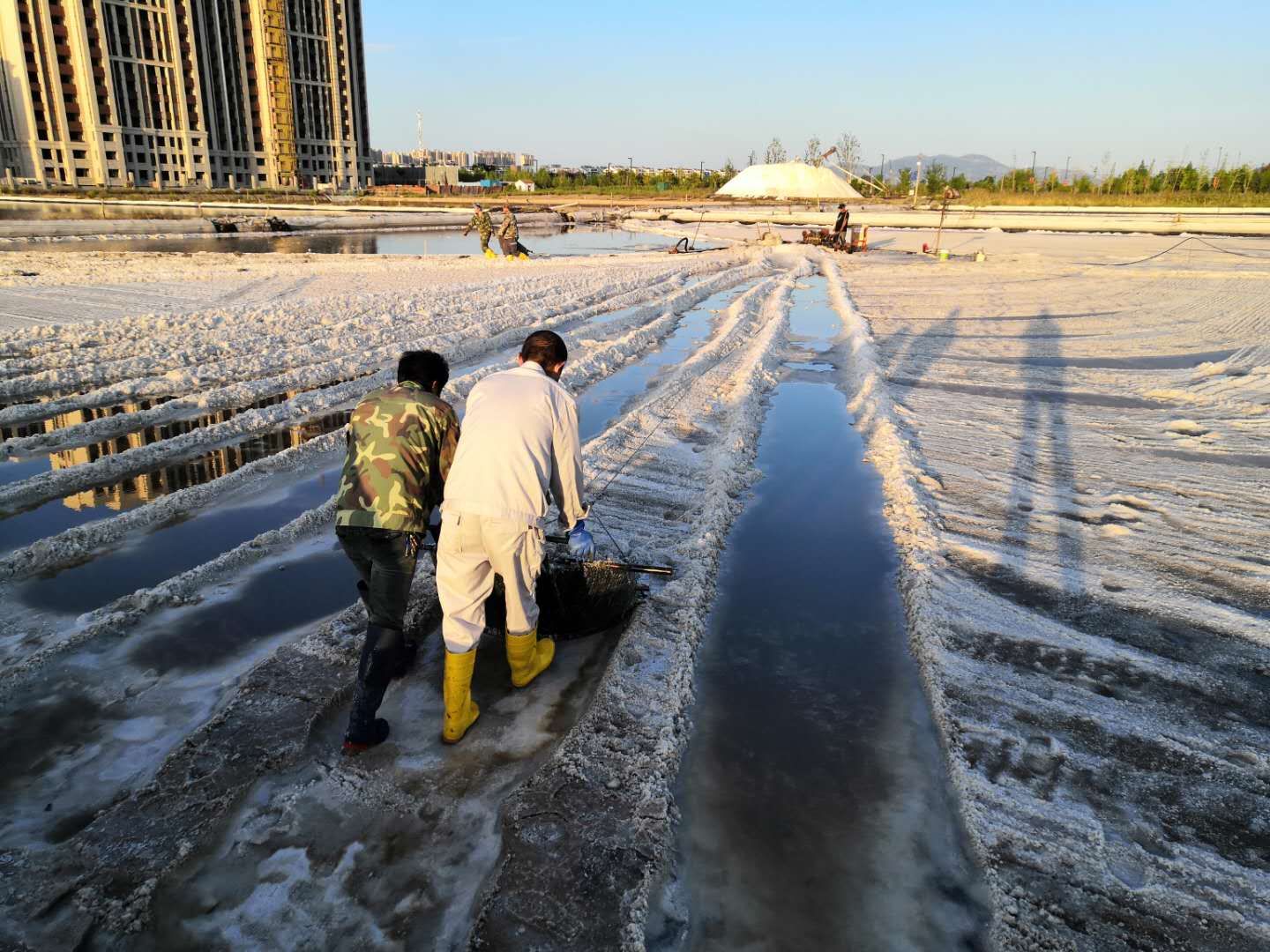 工區(qū)加大結(jié)晶工藝調(diào)整力度,塑苫布及蓋及收,不放過(guò)1毫米蒸發(fā)量,真正做到“云彩縫里奪鹽斤”。對(duì)走完鹽的廩基進(jìn)行泡制,充分挖掘制鹵潛力,抓好窮制鹵。嚴(yán)把結(jié)晶灌池關(guān)、鹵水進(jìn)池關(guān)、塑池管理關(guān)、結(jié)晶環(huán)境關(guān),搶天時(shí)、抓制鹵、促工藝、結(jié)合實(shí)際加深水工,強(qiáng)制飽和鹵水。針對(duì)1415班已征用灘地,在機(jī)械扒鹽后又用人工進(jìn)行二次扒鹽,將塑池內(nèi)的鹽斤徹底收回,真正做到顆粒歸倉(cāng),為完成原鹽生產(chǎn)計(jì)劃盡心、盡力。