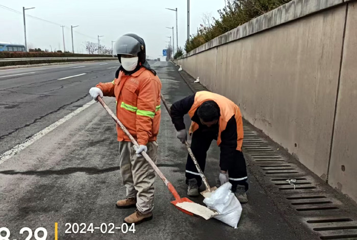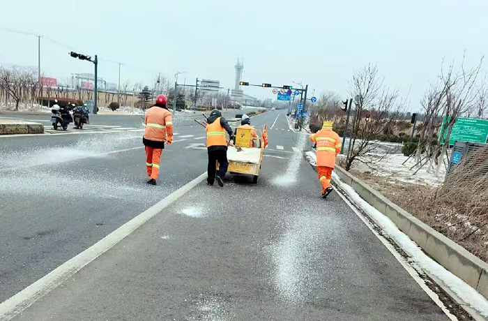 該分公司黨員突擊隊(duì)兵分3路,分別來到徐圩大道、港前大道、海濱大道核心路段。生產(chǎn)骨干沈萬軍、李傳武、張樹華等同志他們相互配合,手拿鐵锨簡單有效的進(jìn)行撒放融雪劑60余噸。發(fā)現(xiàn)道路低洼結(jié)冰處及車輛轉(zhuǎn)彎口,他們立即下車?yán)醚╃P,有來有回的將冰凍鏟除,消除路面一切安全隱患。